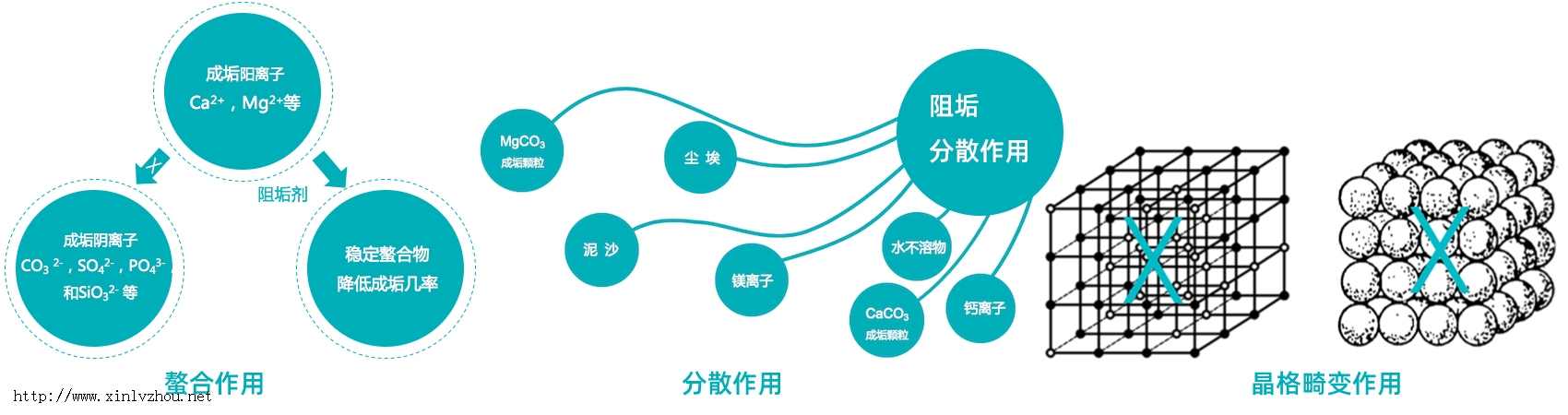 晶格畸變作用:通過提高結垢物質微粒表面的電荷密度使微粒間排斥力增大,降低結晶速率,并使晶格結構發生畸變,從而防止結成硬實的水垢。